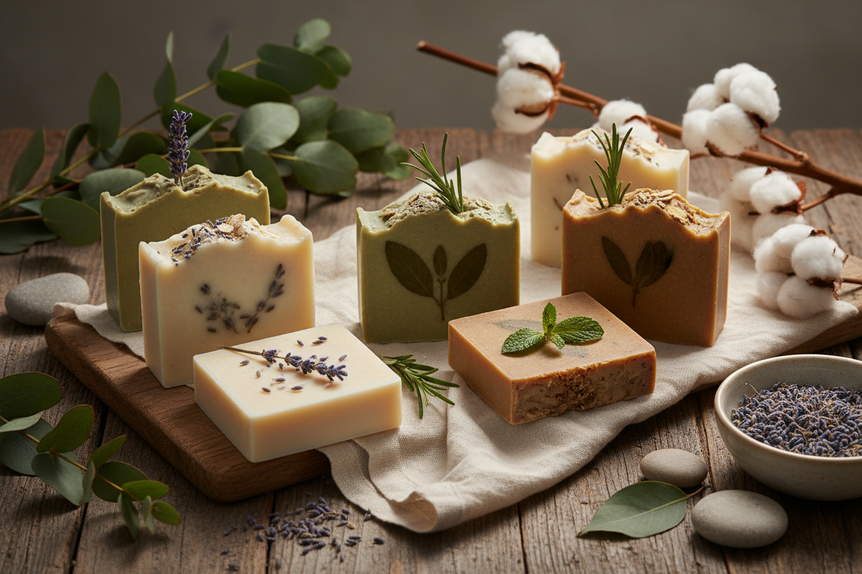 We start with natural oils and butters—olive oil, coconut oil, shea butter, and other plant-based ingredients that nourish your skin. These are the same ingredients you'd find in a kitchen, not a chemistry lab.